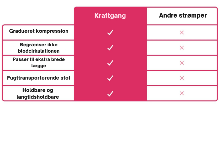 "Som en 68-årig kvinde med flere medicinske udfordringer blev jeg for år tilbage rådet til at bruge kompressionsstrømper fast. Jeg har prøvet over 5 forskellige mærker gennem de sidste 20 år, alle med samme resultat – de virkede ikke. Dette var min første oplevelse med Kraftgang, og jeg er nu fuldstændig overbevist om mærket.